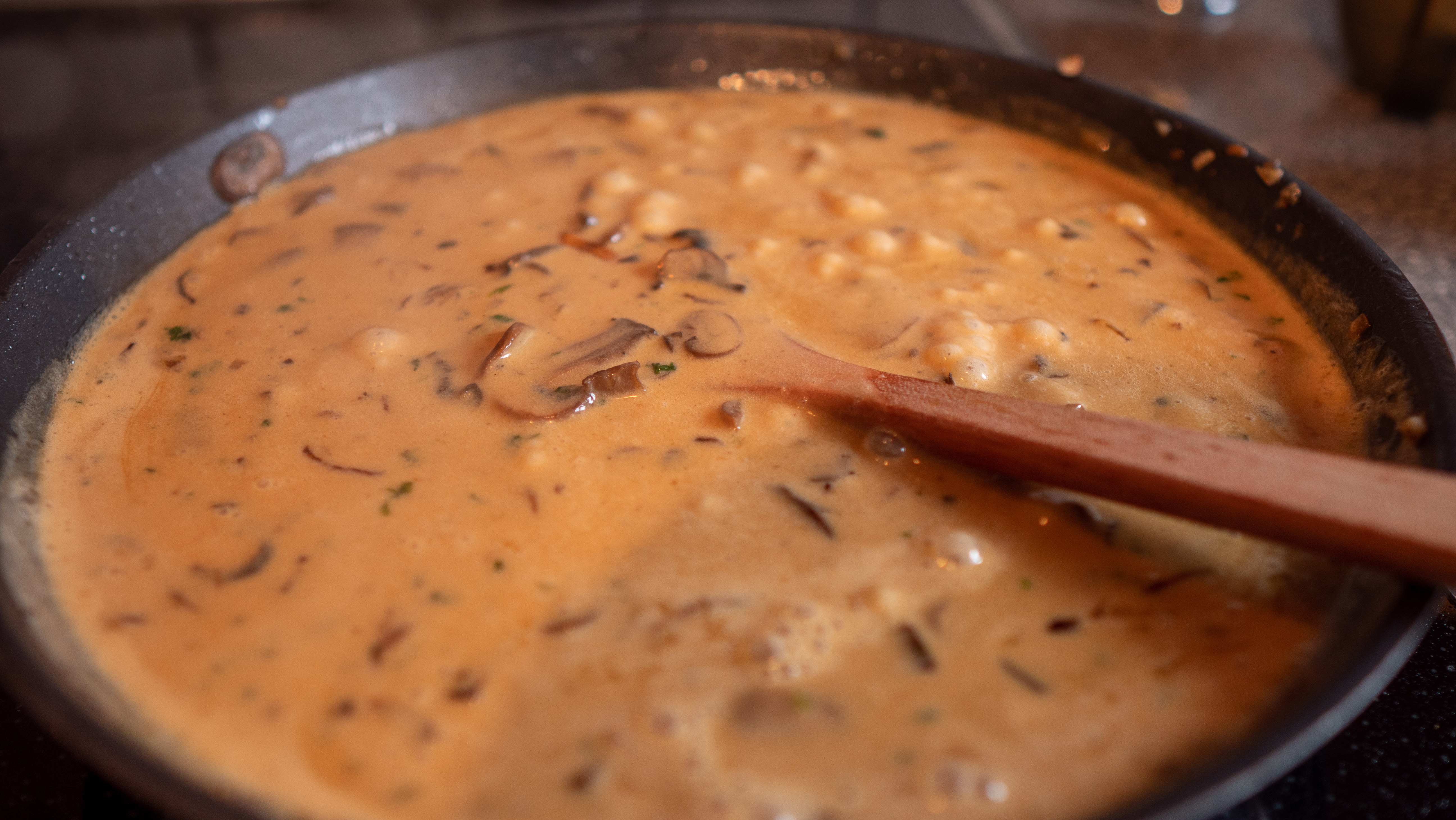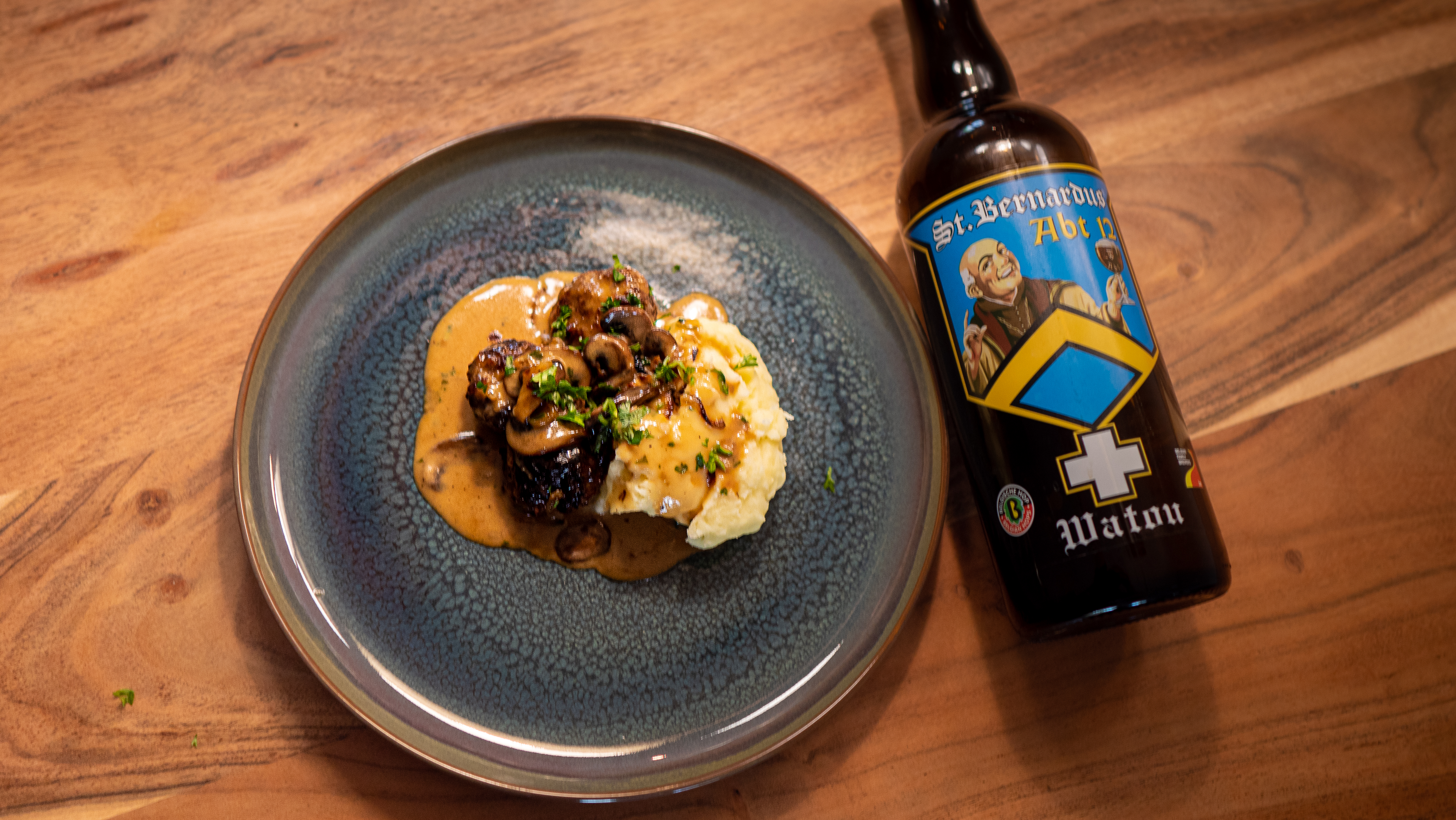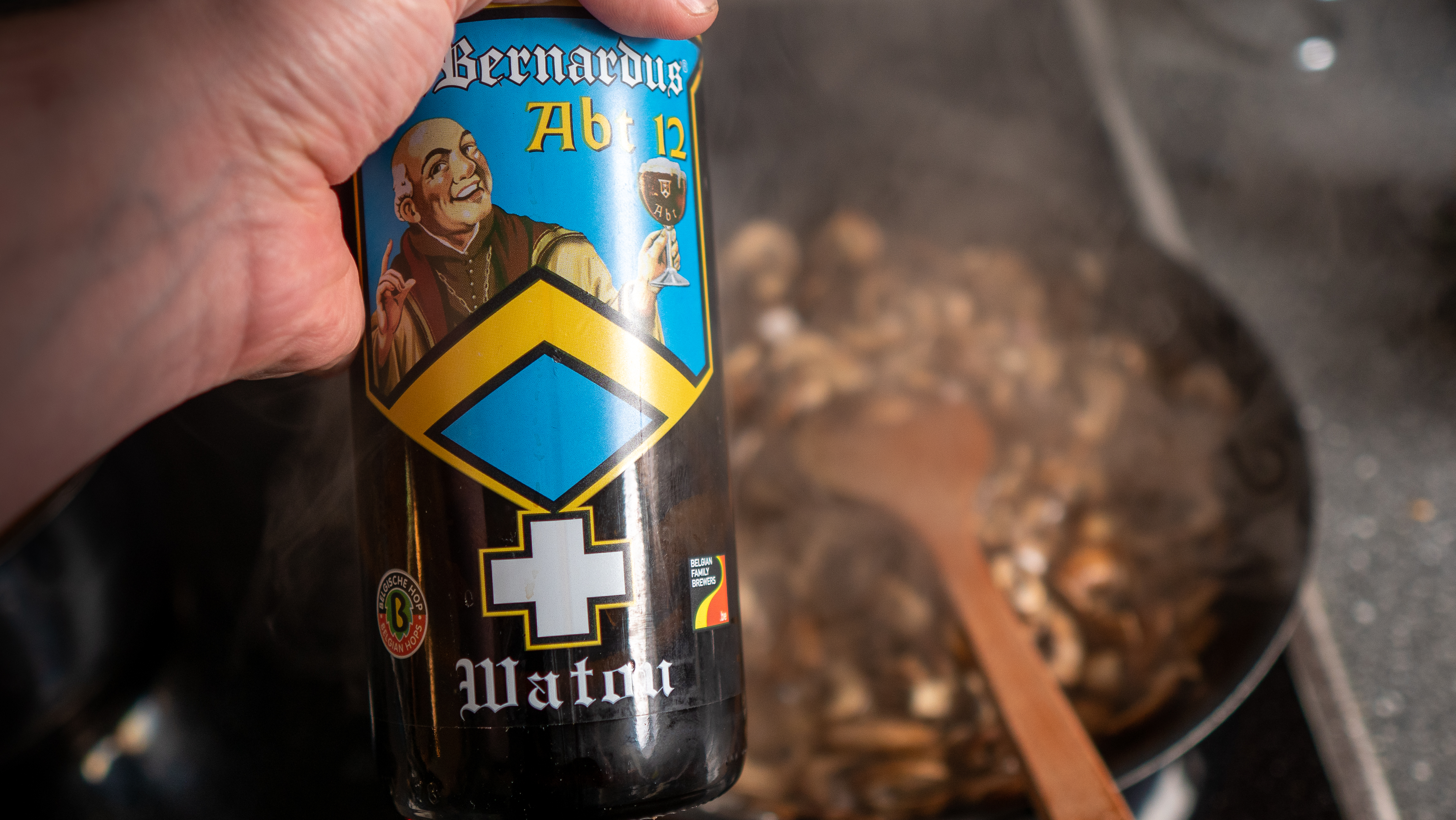 Es ist sicher kein leichtes Gericht (1l Sahne auf 4 Leute), aber gerade deshalb braucht es ein starkes Bier wie ein Quadrupel, das “dagegen halten” kann. Durch das Fleisch und die Pilze hat es sehr viel Umami-Geschmack, das Quadrupel bringt außerdem eine schöne süße Fruchtigkeit in die Sauce, die die Aromen gut ergänzt und unterstützt. Wer es nicht so süß mag sollte den Honig reduzieren oder weglassen.