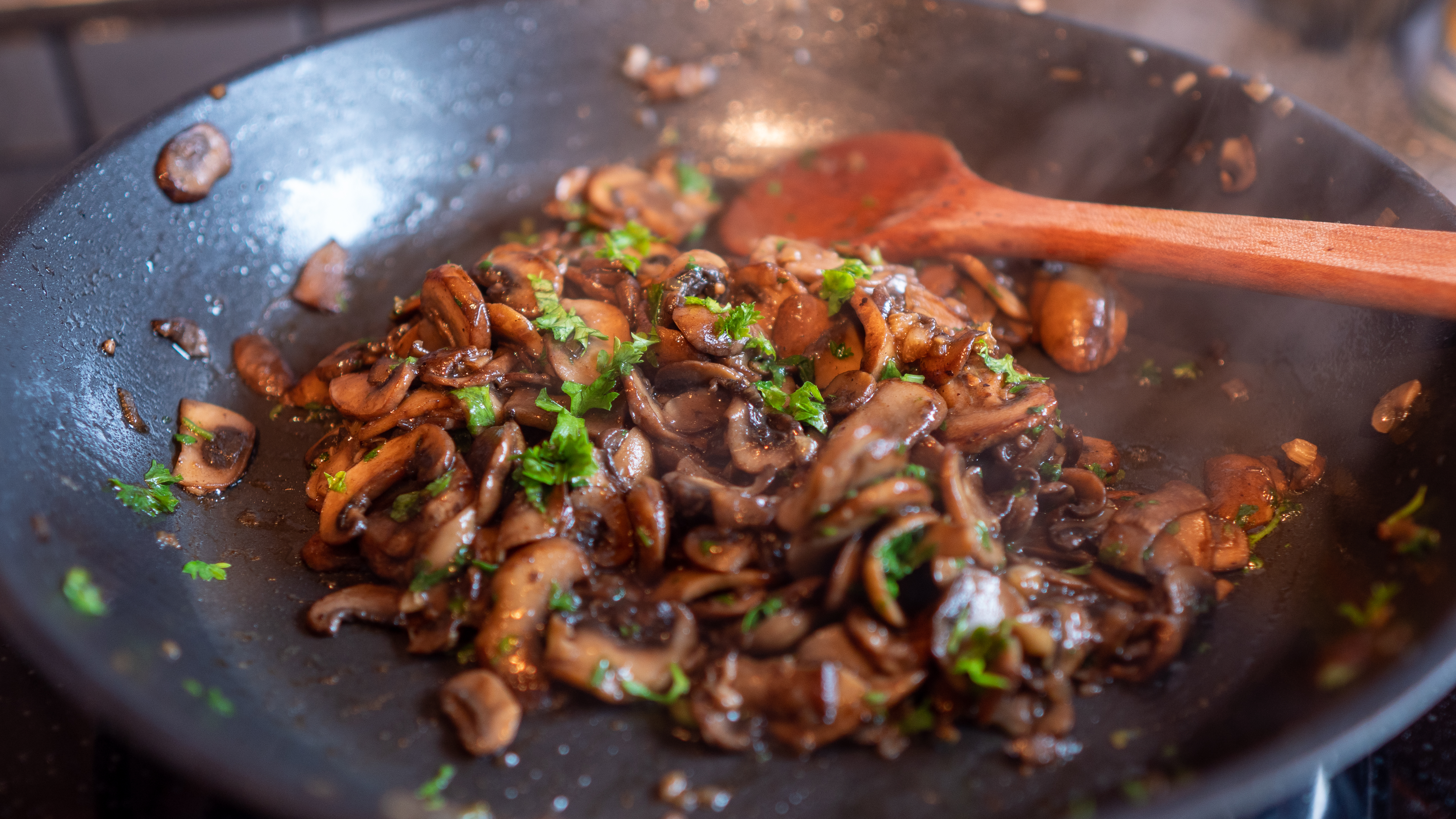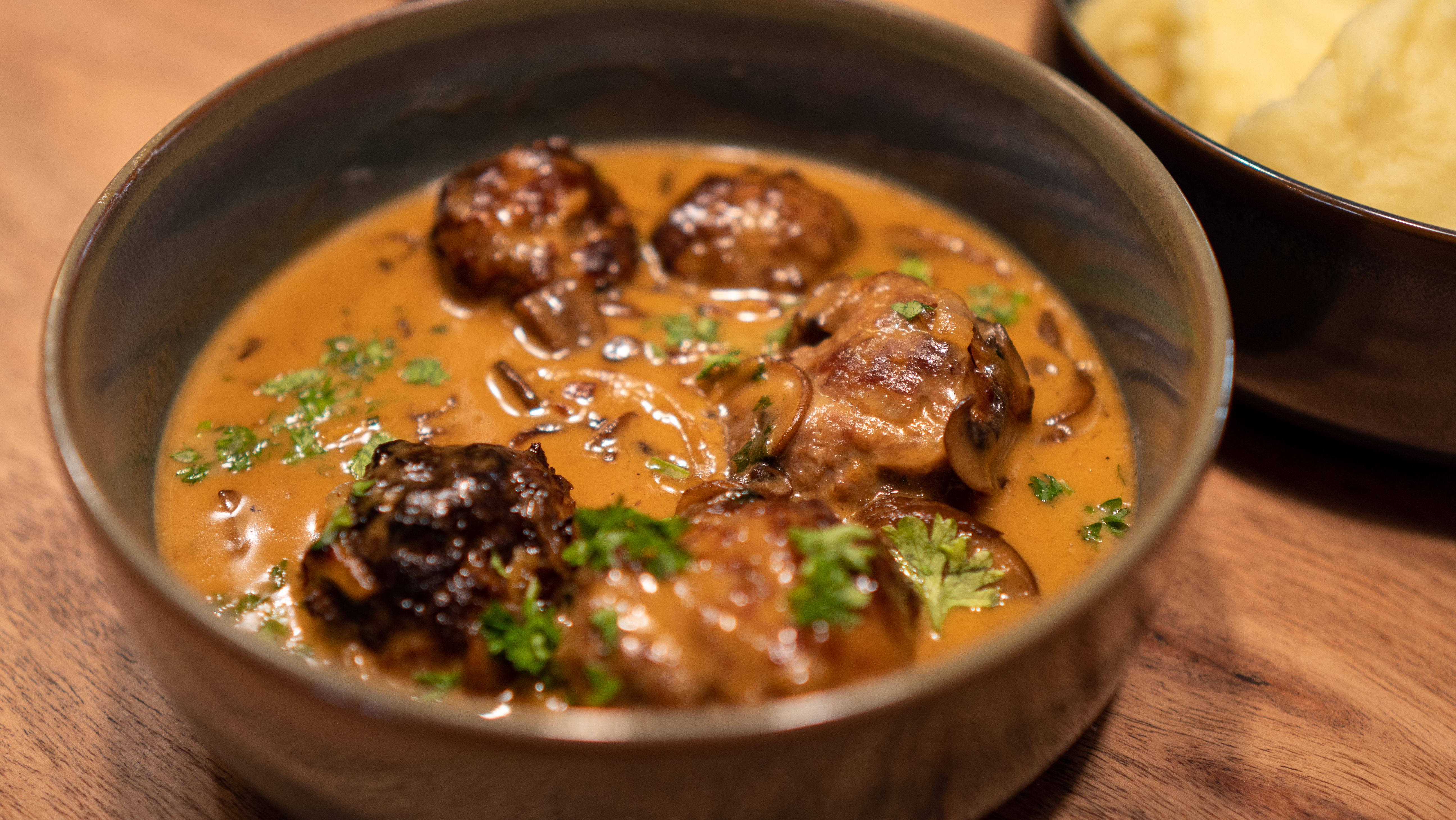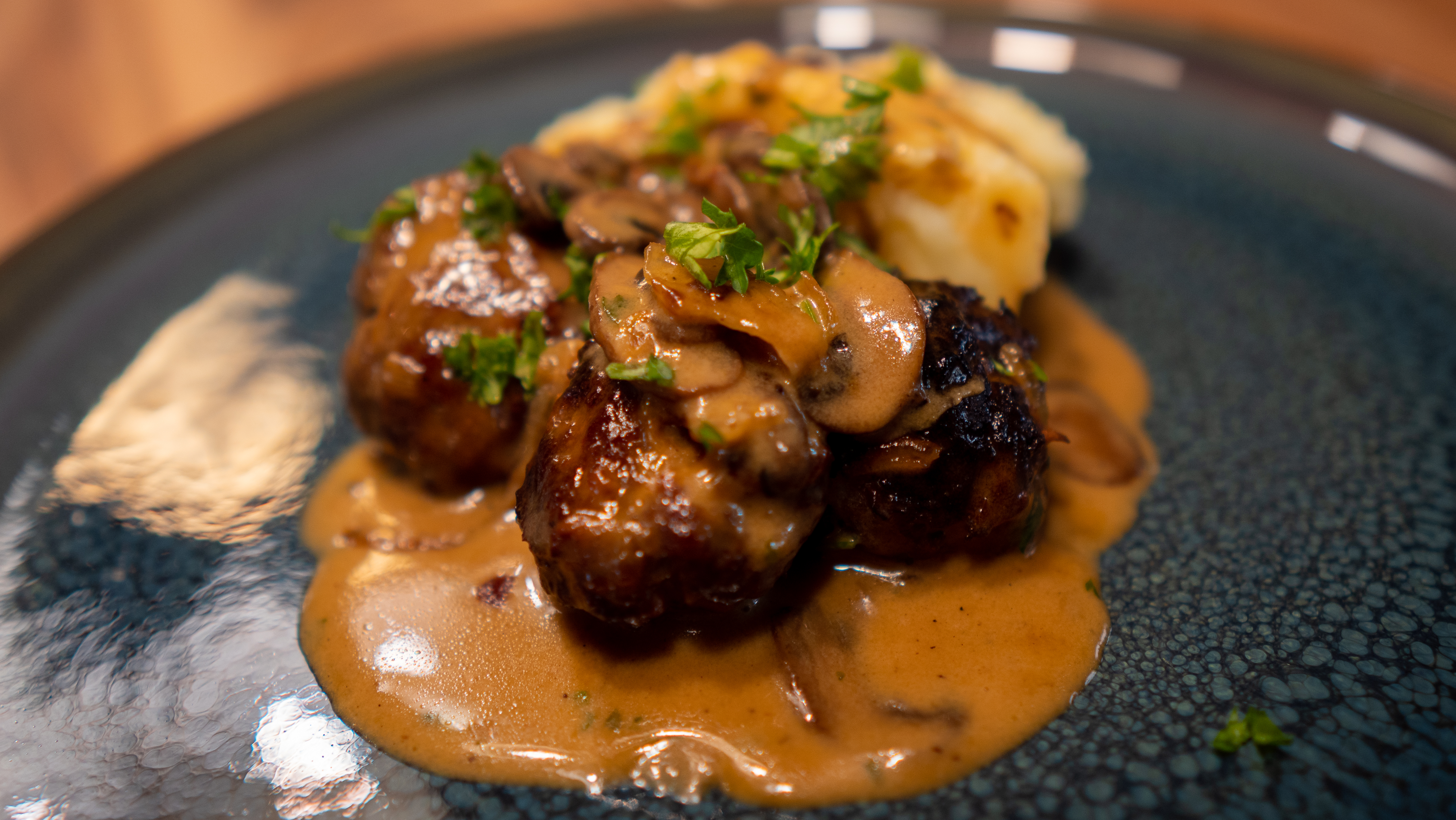 Das genaue Rezept möchte ich hier nicht aufführen, da es ja aus dem Buch stammt und von mir auch nicht angepasst wurde. Wesentliche Bestandteile waren Fleischbällchen (aus Rinder- und Schweinehack mit Sauerteigbrot), Pilze, karamellisierte Zwiebeln und eine Sahnesauce.